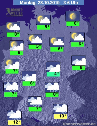 Am Montag bleibt es südlich des Mains bedeckt und es fällt zeitweise Regen. Im übrigen Bundesgebiet ist es verbreitet heiter bis wechselnd bewölkt, dabei sind an der Nordsee lokale Schauer möglich, sonst bleibt es weitgehend trocken. Die Temperatur erreicht 9 Grad im Grabfeld und bis 12 Grad entlang des Rheins.