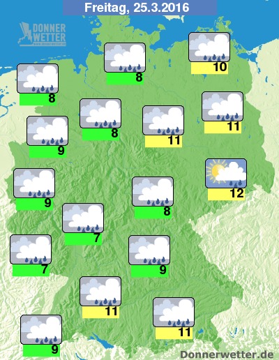 Heute bleibt es über der Bundesrepublik verbreitet bedeckt und es fällt auch immer wieder Regen, erst zum späten Nachmittag und gegen Abend klingt der Regen von Nordwesten her nach und nach ab und nachfolgend lockert die Bewölkung hier auch auf. Die Temperatur steigt auf 7 Grad im Saargau und bis 12 Grad in Leipzig.
