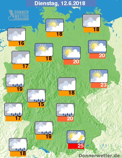 Am Dienstag bleibt es nördlich eines Streifens vom Ruhrgebiet bis zur Lausitz trocken und oft aufgelockert, zum Teil aber auch stark bewölkt. Weiter nach Süden und Südwesten hin halten sich dagegen verbreitet dichte Wolken und es fällt zeitweise Regen. Im Süden bilden sich oft kräftige Schauer und Gewitter. Die Temperatur erreicht 16 Grad an der Nordsee und bis 25 Grad in München.