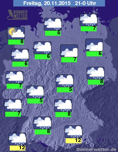 Heute Nachmittag präsentiert sich vor allem die Südhälfte Deutschlands verbreitet sehr nass mit oft starkem und teils ergiebigem Regen, aber auch im Norden ist es meist stark, gebietsweise aber auch aufgelockert bewölkt, dazu fällt jedoch nur regional Regen und oft bleibt es auch trocken. Die Temperatur liegt bei 6 Grad in Oberfranken und bis 14 Grad im Oberrheingraben. Im Süden weht oft starker, teils auch stürmischer Wind, dabei sind Sturmböen möglich.