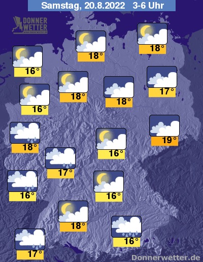 In der Nacht zum Samstag bilden sich über der Südwesthälfte des Landes unter dichten Wolken häufig Schauer. Weiter nach Nordosten hin ist es auch oft stark, gebietsweise aufgelockert bewölkt, jedoch weitgehend trocken. Die Temperatur sinkt auf 19 Grad in Dresden und etwa 16 Grad in Saarbrücken.