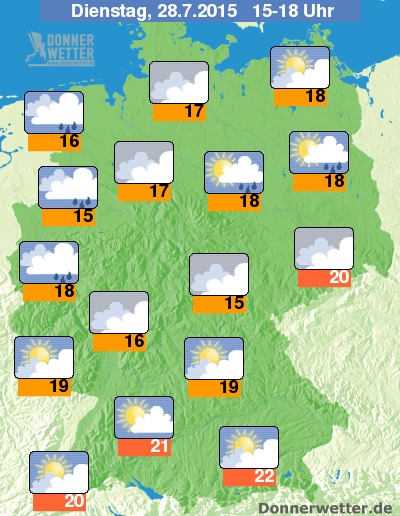 Heute Nachmittag ist es im Süden von Deutschland locker oder aufgelockert bewölkt und trocken, über die Nordhälfte ziehen hingegen oft dichte Wolken und es bilden sich gebietsweise Schauer. Die Temperatur steigt auf 15 Grad im Münsterland und bis 22 Grad in München.