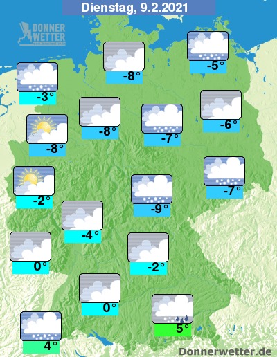 Am Dienstag bleibt es häufig stark bewölkt, hier und da und vor allem im Westen sind aber auch Auflockerungen möglich, hier bleibt es zudem meist trocken. Im übrigen Land fällt hingegen gebietsweise Schnee. Im Alpenvorland kann bei mildere Luft auch Schneeregen oder Regen fallen. Die Temperatur steigt nur noch auf -9 Grad in Erfurt und bis 5 Grad in Berchtesgaden.