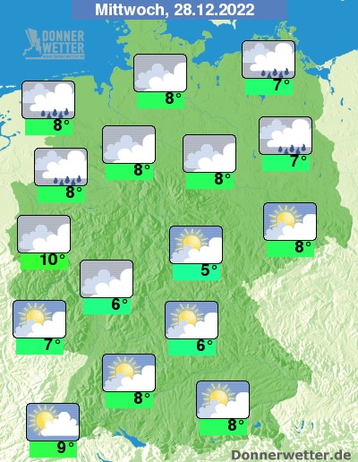 Am Mittwoch scheint im Süden hier und da die Sonne, im übrigen Land bleibt es bei verbreitet starker bis dichter Bewölkung. Im Norden fällt zudem gebietsweise Regen, während es sonst weitgehend trocken bleibt. Die Temperatur erreicht 5 Grad in Erfurt und bis 10 Grad in Köln. Im Norden und Westen ist es zum Teil stürmisch, an der Nordsee herrscht Sturm.