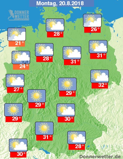Heute erwartet uns ein überwiegend heiterer bis sonniger und dabei trockener Sommertag. Über den Norden und Nordwesten ziehen allerdings auch zum Teil dichte Wolken hinweg, dabei sind jedoch nur vereinzelte Schauer möglich. Die Temperatur erreicht 21 Grad in Cuxhaven und bis 32 Grad in Dresden.