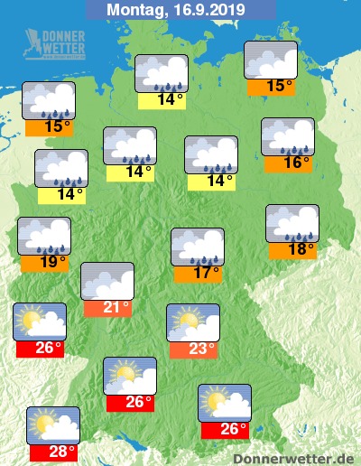 Zum Start in die neue Woche kann sich im Süden zwischen den Wolken noch zeitweise die Sonne blicken lassen, hier bleibt es auch trocken. Im übrigen Bundesgebiet hält sich hingegen meist dichte Bewölkung und es fällt auch gebietsweise Regen. Die Temperatur steigt auf 14 Grad in der Norddeutschen Tiefebene und bis 28 Grad im Breisgau.