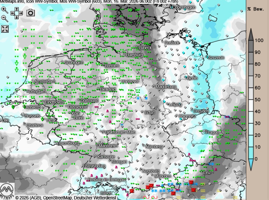 Am Montag zeigt sich der Himmel über weiten Landesteilen wechselnd oder stark bewölkt; dabei muss zeit- und gebietsweise mit Regen oder Schauern / Graupelschauern gerechnet werden.