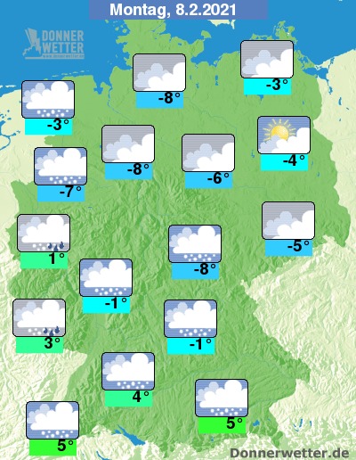 Am Montag bleibt es überm Land weitgehend dicht bewölkt, im Norden ist es dazu größtenteils trocken, sonst fällt aber zeitweise Schnee, im Südwesten fällt gebietsweise Schneeregen oder Regen. Die Temperatur steigt auf sehr kalte -8 Grad im Alten Land und bis zu 5 Grad im Breisgau. An den Küsten weht noch ein zum Teil stürmischer Wind.