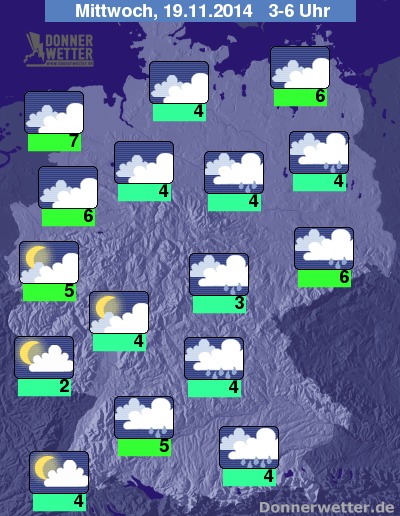 In der kommenden Nacht bleibt der Himmel weitgehend bedeckt, nur im Südwesten und äußeren Westen kann es auch mal etwas auflockern, hier bleibt es auch trocken. Dagegen fällt in der Südosthälfte des Landes, und hierbei besonders im Süden immer wieder Regen. Weiter nach Nordwesten bleibt es dagegen weitgehend trocken. Im Südwesten und im äußeren Westen bildet sich stellenweise Nebel oder Hochnebel. Die Temperatur sinkt bis zum Morgen auf 7 Grad an der Nordseeküste und bis 2 Grad am westlichen Hunsrück.