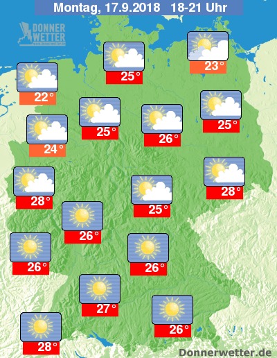 Die Temperaturen erreichen am Abend noch Werte um 22 bis 28 Grad C, am späten Abend kühlt es auf 17 bis 22 Grad C ab.
