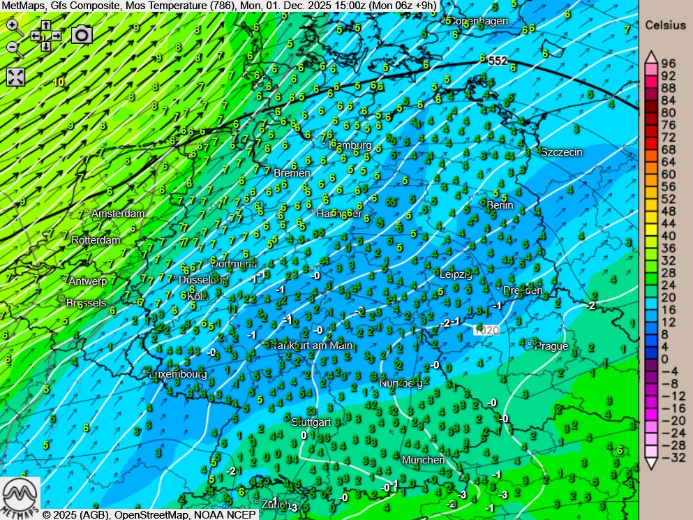Die Strömungs- / Temperaturkarte sowie die Wetterkarte für Montagnachmittag (15:00 Uhr) nach GFS:
