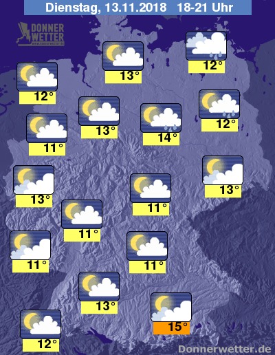 Vor Dämmerungsbeginn liegen die Temperaturen bei milden 11 bis 15 Grad, am wärmsten bleibt es dabei um München herum.