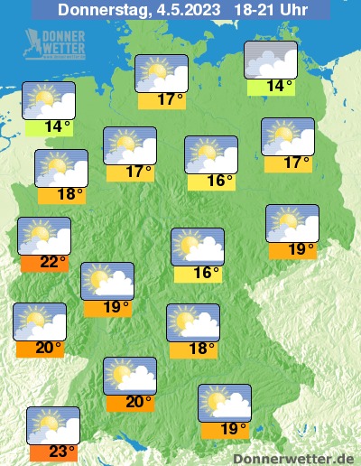 In der Nacht zum Freitag zieht von Westen he eine Schauerfront in die westlichen Landesteile, vereinzelt sind dabei auch kurze Gewitter möglich. Im übrigen Land ist es auch oft stark, teils aber auch aufgelockert bewölkt, dazu bleibt es trocken. Die Temperatur sinkt auf milde 14 Grad in Freiburg und bis 5 Grad in Neubrandenburg.