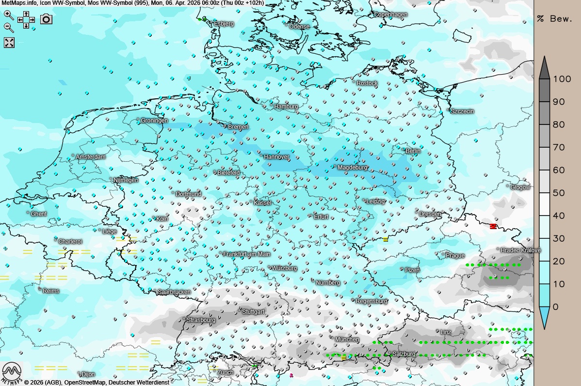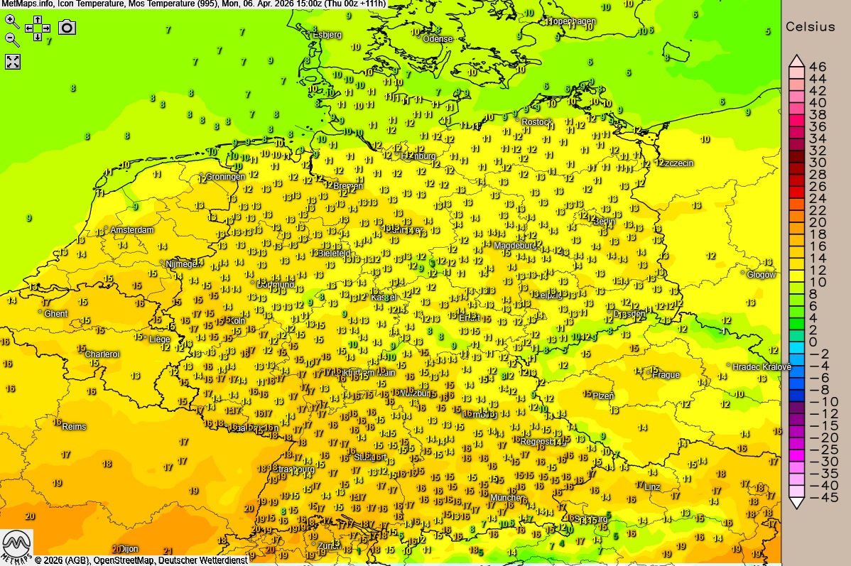 Die Wetterkarte für Ostermontag (06:00 Uhr) sowie Temperaturen und Temperaturabweichung um 15:00 Uhr nach ICON: