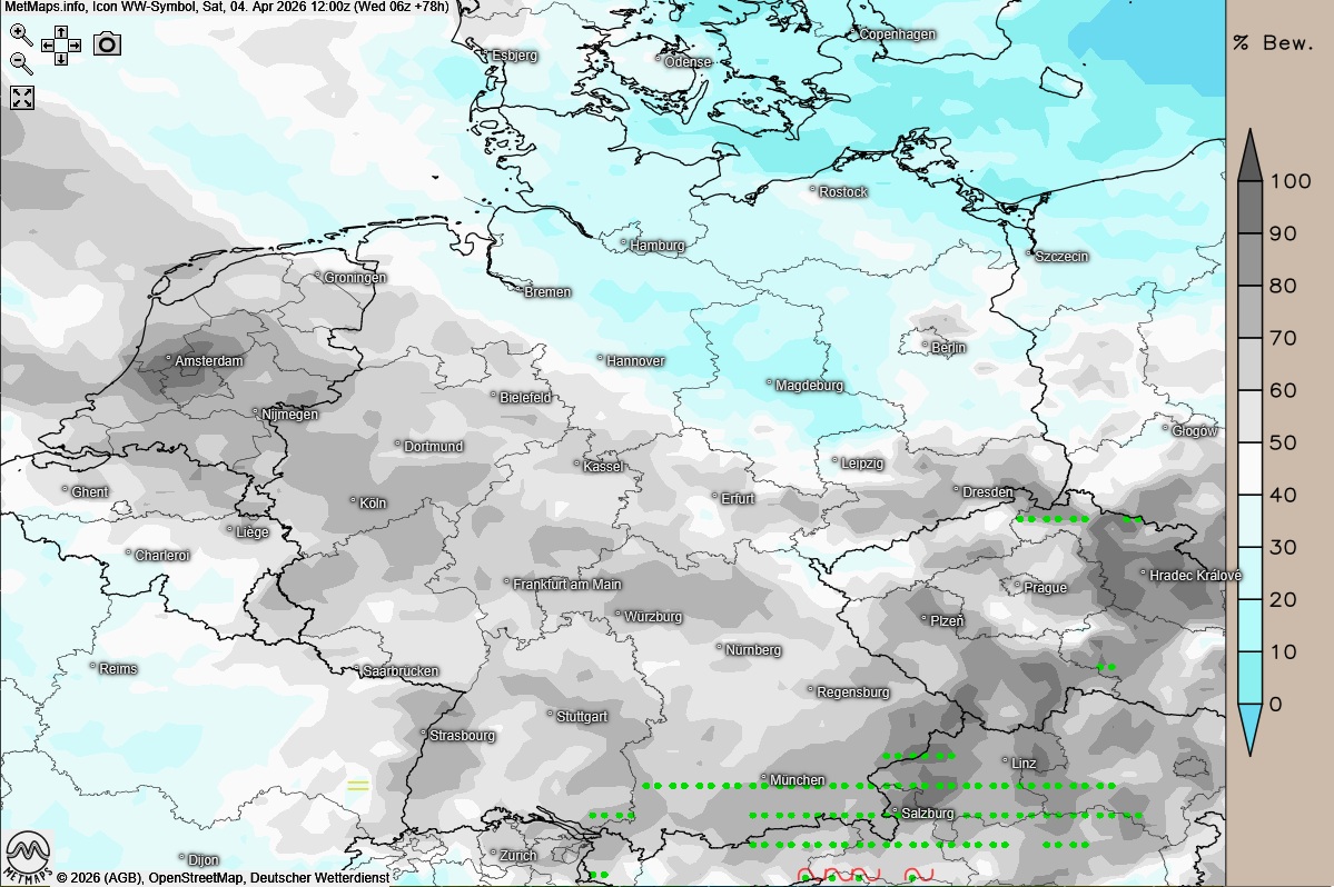 An Karsamstag zeigt sich der Himmel über weiten Landesteilen zunächst stark bewölkt, dabei kann lokal auch etwas Regen fallen. Im Tagesverlauf lockern die Wolken von Süden/Südwesten dann immer weiter auf, vor allem im Süden ist es am Nachmittag und Abend auch sonnig.