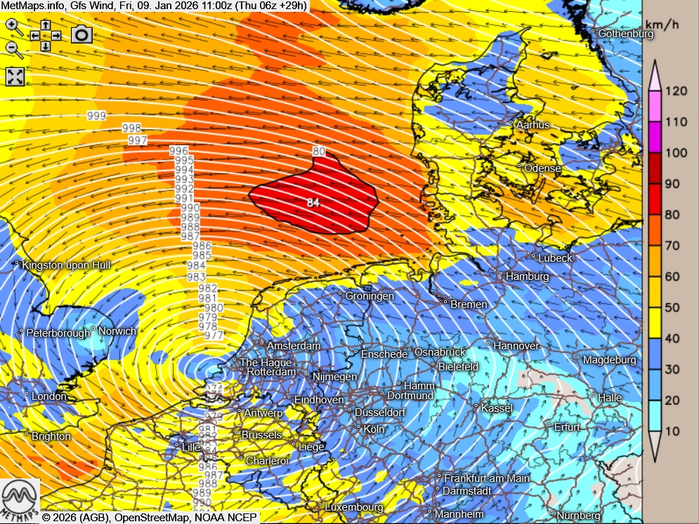Es weht ein mäßiger bis frischer, im Südwesten und Norden stürmischer Wind. An der See und im Schwarzwald teils auch orkanartige Böen.