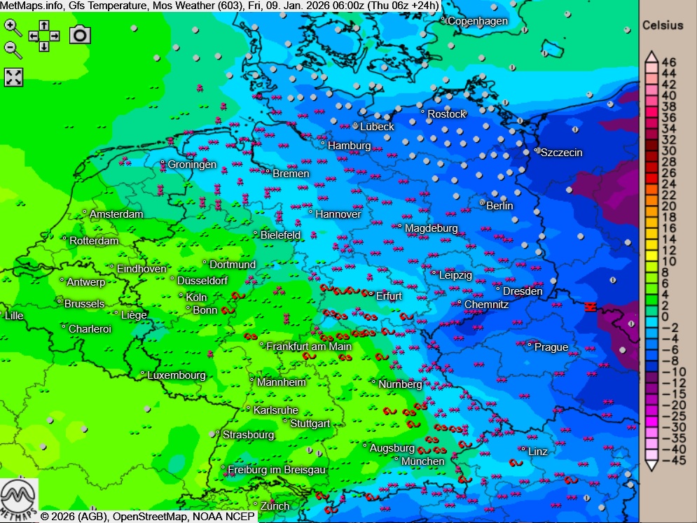 Die Windkarte für Freitagvormittag (11:00 Uhr), sowie die Wetter- / Temperaturkarten für Freitagmorgen (06:00 Uhr) nach GFS: