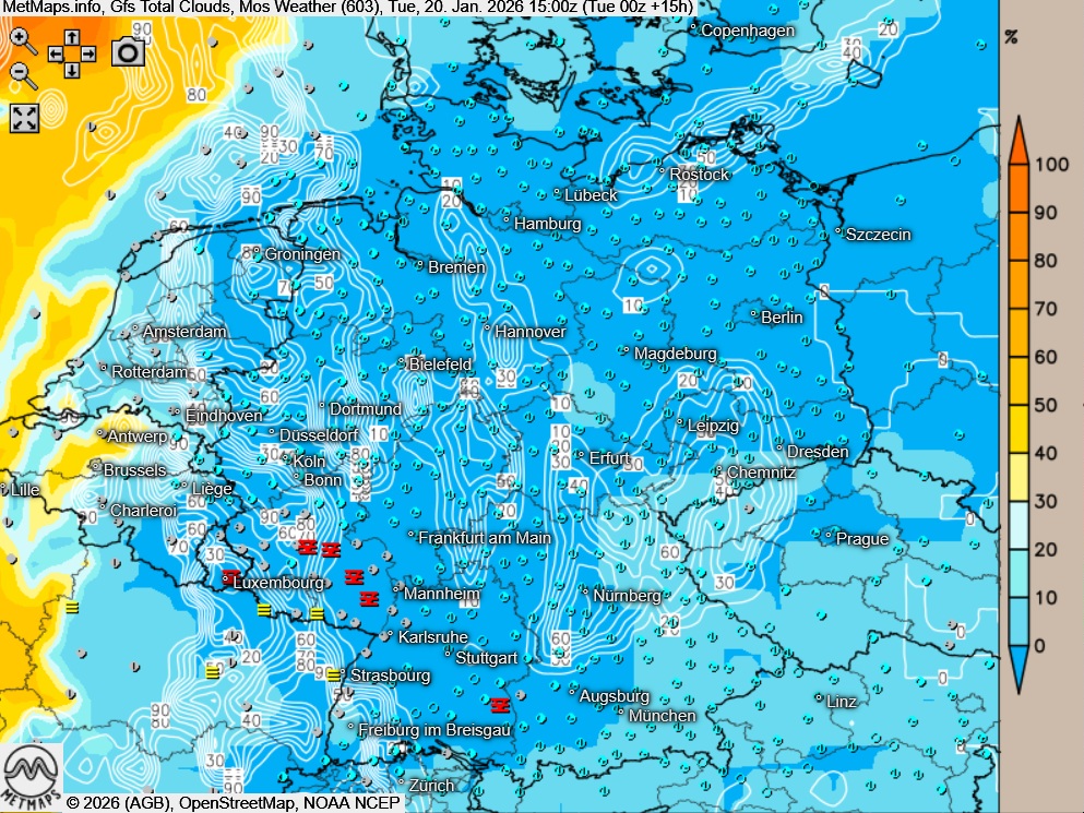 Am Dienstag kann sich im Südwesten teils ganztägig zäher Nebel-/ Hochnebel halten. Ansonsten scheint nach Nebelauflösung über weiten Landesteilen die Sonne von einem wolkenlosen Himmel und es bleibt niederschlagsfrei.