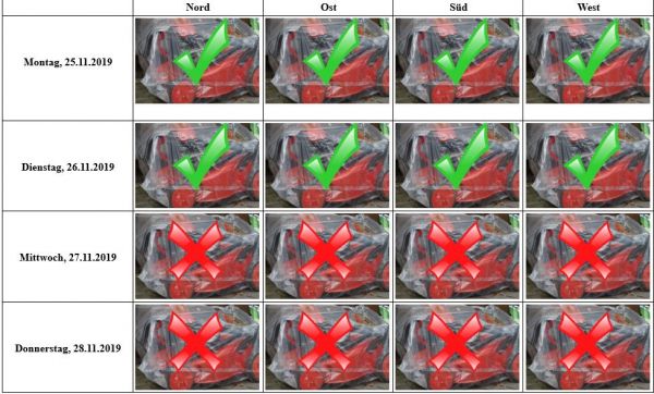 Für die Woche zeigt sich das Wetter zumindest am Montag und Dienstag noch verbreitet trocken, wenn auch ebenso weitgehend trüb bzw. stark bewölkt. Trotzdem sind die ersten beiden Tage für die Arbeit im Freien deutlich besser geeignet als bspw. der Mittwoch und der Donnerstag, an denen von Südwesten bzw. Westen her Tiefausläufer mit zeitweiligen Regenfällen durchziehen. Über den Vorhersagezeitraum bleibt es jedoch mild, so dass keine Frostgefahr besteht.