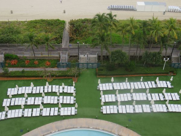In den siebziger Jahren hat man in Miami Beach Strandsicherung betrieben. Einen Pflanzengürtel durch das Militär angepflanzt, der jetzt überlebenswichtig wird. Er wird das Wasser am Strand zu den Hotels bremsen. Es sind nur wenige Meter, wie hier beim weltberühmten aus 007 bekannten Hotel Fountainebleau Miami Beach zu sehen ist.