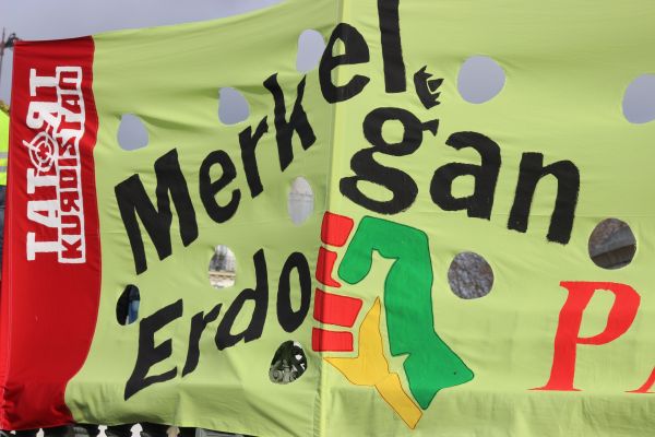 Dieses Plakat drückt es so aus: Unsere Kanzlerin übergab dem türkischen Staatschef Erdogan 3 Milliarden Euro zum "Abschuss der Kurden".
