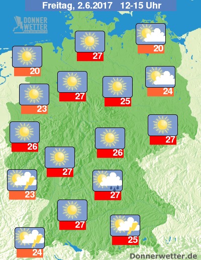 In Quickborn (nordwestlich von Hamburg, Schleswig-Holstein) startete der neue Monat (01.06.) in den Morgenstunden mit leichtem Bodenfrost bis -1 Grad C. Auch sonst gab es in Teilen Norddeutschlands eine sehr frische Frühsommernacht. Tagsüber dominierte in vielen Gebieten Deutschlands jedoch freundliches Sommerwetter mit Höchsttemperaturen zwischen 22 und 29 Grad C. Über dem Schwarzwald und im Alpenvorland sorgte schwüle Luft örtlich für teils kräftige Schauer und Gewitter.