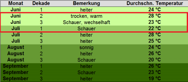 Heißt: Die Fußballbegeisterten dürfen sich jetzt schon mal auf bestes Fanmeilen-Wetter freuen. Bei Höchsttemperaturen um 28 Grad C in der zweiten Junidekade wird also auch zu späterer Stunde (die meisten Spiele werden erst um 18:00 bzw. 21:00 Uhr angepfiffen) das kurzärmlige Deutschlandtrikot vollkommen ausreichen.