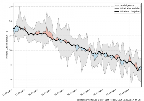 Warme, freundliche und trockene geben wechselhaften und zu kühlen Wetterphasen die Klinke in die Hand. Die Wahrscheinlichkeit eines langen freundlichen Spätsommers und / oder eines goldenen Herbstes ist nach aktuellen Berechnungen nur gering.