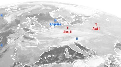 Das heutige Satellitenfoto zeigt einen breiten freundlichen Abschnitt mit viel Sonnenschein und nur geringer Bewölkung von der Iberischen Halbinsel bis nach Italien, weiter östlich vom zentralen Mittelmeer bis in die Türkei ist es dagegen vielfach dicht bewölkt und es entwickeln sich zahlreiche Schauer, teils auch Gewitter. Auch Mitteleuropa wird von Tiefdrucksystemen dominiert, so regnet und schneit es von der französischen Atlantikküste, über Frankreich, Deutschland bis hinein nach Osteuropa. In Großbritanien ist es meist wechselnd bewölkt bei nur wenigen Schauern, zumeist bleibt es trocken. In Skandinavien herrscht im Süden meist Hochdruckeinfluss und es bleibt trocken, nach Norden hin ziehen Tiefdruckausläufer übers Land und sorgen verbreitet für Schneefälle.