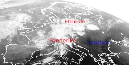 Auf dem heutigen Satelittenfoto zeigen sich vielfach dichte Wolken über Mitteleuropa, speziell über dem Osten und Süden Deutschlands sowie entlang der Alpen kann es in den nächsten 24 Stunden zu großen Niederschlagsmengen zwischen 30 und 60 Litern, örtlich bis zu 100 Litern kommen. Es ist mit Überschwemmungen an kleineren bis mittleren Flussläufen zu rechnen.
