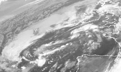 Der breite Wolkenschirm, der sich vom Atlantik bis nach Irland erstreckt, gehört zu dem Atlantiktief 'Arfst'. Auf seiner Südseite bilden sich in polarer Luft, die das Tief um sich herumgezogen hat, teils kräftige Gewitter, die sich als hellere Wolkenkleckse westlich der Biskaya abheben.