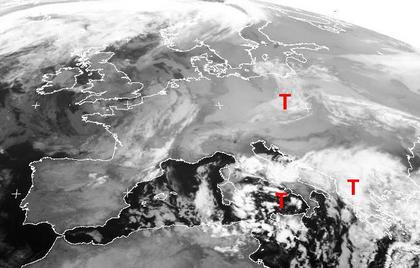 Das Tief über Polen sorgt heute noch für Wolken und etwas Schnee von der Ostsee bis nach Österreich. Zwei weitere Tiefdruckgebiete über dem Mittelmeer und Griechenland bringen Schauer und Gewitter von Italien bis zum Schwarzen Meer. Von Südschweden bis Portugal sorgt zunehmender Hochdruckeinfluss für ruhiges, teils auch trübes Winterwetter.
