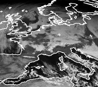 Hoch 'Bernhilde' bestimmt das Wetter über weiten Teilen West- und Mitteleuropas. Auf dem Satellitenbild erkennt man jedoch häufig dichte hochnebelartige Bewölkung über Deutschland. Gebietsweise tritt sie auch weiter im Westen auf, in Frankreich und England. Aber auch einige Auflockerungen sind dazwischen. (Bildquelle: NERC Satellite Receiving Station, Dundee University, Scotland, http://www.sat.dundee.ac.uk/)
