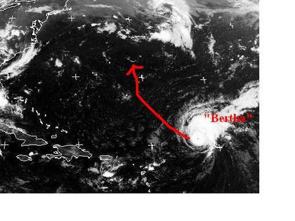 Auf dem Satellitenbild von Dienstag früh ist der Hurrikane 'Bertha' nordöstlich der Karibik gut zu erkennen. Zur Zeit erreicht er mittlere Windgeschwindigkeiten von 195, in Böen 240 km/h. Berechnungen zufolge soll er langsam nordwestwärts ziehen und sich wieder etwas abschwächen. Sein Endziel ist allerdings noch unklar. (Bildquelle: NERC Satellite Receiving Station, Dundee University, Scotland, http://www.sat.dundee.ac.uk/)