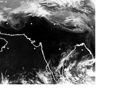Auf dem Satellitenbild von Dienstag früh sind Indien und die nördlicheren Regionen fast wolkenfrei. Gut zu erkennen ist auch der Verlauf des Himalayagebirges, dass sich mit seinen kühleren Temperaturen (im Infrarotbereich heller dargestellt) deutlich vom wärmeren Indien abhebt. (Bildquelle: NERC Satellite Receiving Station, Dundee University, Scotland, http://www.sat.dundee.ac.uk/)