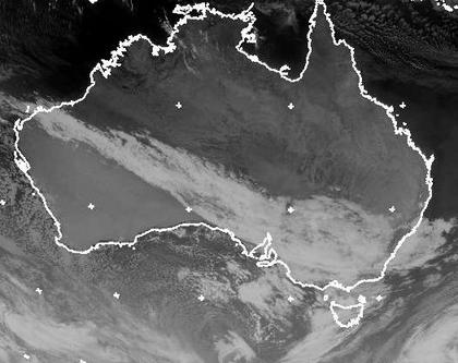 Die Kaltfront eines Tiefs über dem Südpolarmeer liegt mit ihrer Bewölkung quer über Australien, vom Westen bis in den Südosten. Regen gibt es vor allem im Südosten, teils aber auch im Landesinneren. Abseits des Wolkenbands finden sich jedoch kaum Wolken über dem Kontinent.
