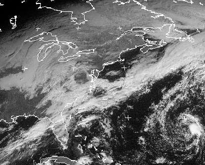 Das Wolkenband einer nach Südosten ziehenden Kaltfont erstreckt sich vom Golf von Mexiko bis vor die Küste Neufundlands. Auf ihrer Rückseite gelangt allmählich kältere Luft in den Osten der USA. Während die Bewölkung auf der Rückseite der Front zunächst abnimmt, bildet sich über dem Mittleren Westen ein neues Tief, aus dessen dichten Wolken teils schon Schnee oder Regen fällt.