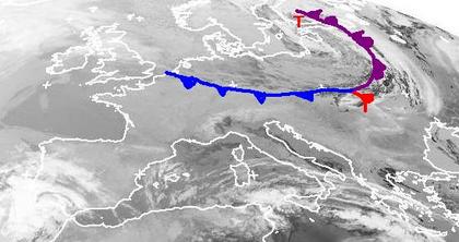Auf dem Satellitenbild von Freitag früh liegt die Kaltfront von Tief 'Xenophon' quer über Deutschland und trennt relativ warme Luftmassen im Süden von kalter aus dem Norden. Auch am Tag macht sich diese Luftmassengrenze bemerkbar. Im Norden bleibt es heute deutlich kühler als im Süden. (Bildquelle: NERC Satellite Receiving Station, Dundee University, Scotland, http://www.sat.dundee.ac.uk/)
