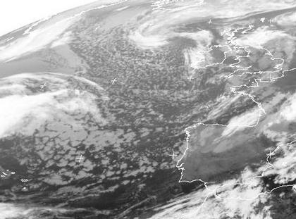 Während Tief 'Ingo' bei uns noch für subtropische Temperaturen sorgt, kann auf seiner Westseite deutlich kühlere Polarluft bis weit nach Süden vordringen. Auf ihrem Weg erwärmt sie sich zwar, dennoch werden auf den Azoren am linken unteren Bildrand heute nur 20 Grad erreicht, im Westen Irlands nur knapp über 10 Grad. In der kühlemn Luftmasse können sich über dem wärmeren Meer kräftige Schauerwolken entwickel. Zwischen ihnen sinkt die Luft wieder ab, um erneut erwärmt zu werden. Dadurch entsteht das charakteristische Scheckenmuster, das an die Blasen in einem von unten erhitzten Kochtopf mit Wasser erinnert.