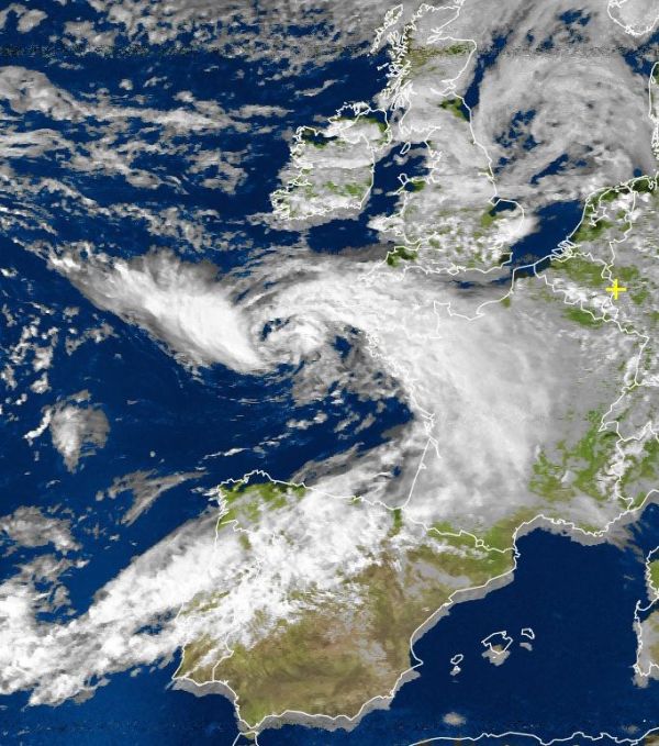 Auf dem Satellitenfoto von heute Nachmittag erkennen wir ein kräftiges Tief westlich von Frankreich über dem Atlantik. Es bringt mit einem ausgeprägten Ausläufer kompakte Wolken vor allem nach Frankreich, aber auch auf die Iberische Halbinsel. Unter den dichten Wolken ist es vielerorts sehr regnerisch, mit zum Teil sehr kräftigem und langanhaltendem Regen, zum Teil auch mit kurzen Gewittern.