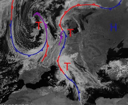 Tief 'Ulysses' über Norditalien sorgt mit seinen vielen Wolken für teils ergiebigen Regen auf der Alpensüdseite sowie am zentralen Mittelmeer. Weiter nach Norden befindet sich das Tief 'Thies', das Deutschland in einen freundlichen Osten und einen wechselhaften Westen trennt. Des Weiteren zeigt sich vor den Britischen Inseln das Tief 'Volker'. Dagegen herrscht nach Osten hin unter dem Einfluss von Hoch 'Steffi' über Russland häufig wolkenloses Wetter, auch am westlichen Mittelmeer ist es meist freundlich.
