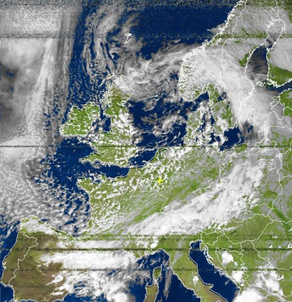 Auf dem Satellitenfoto von heute Nachmittag ist das Zentrum des Tiefs über der Nordsee zwischen Schottland und dem südlichen Norwegen zu erkennen. Dieses Tief bringt praktisch der gesamten Nordwesthälfte insgesamt wechselhaftes Wetter mit kühlen Luftmassen und einzelnen Schauern. Dabei stauen sich die Wolken vor allem an den Alpen, wo es zu verbreitet langanhaltenden und teils ergiebigen Niederschlägen kommt.