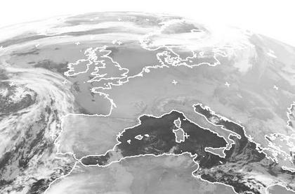 Auf dem Satellitenbild findet man höhere Bewölkung nur über dem Atlantik und über dem Norden Europas. Über Mitteleuropa liegt nur verbreitet Hochnebel, der nur schwach zu erkennen ist. Nach Osten hin findet man auch gering bewölkte Bereiche.
