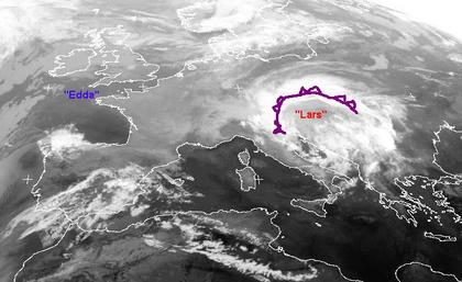 Der schwache Ausläufer eines Tiefs über Skandinavien bringt etwas dichtere Wolken über die Ostsee und in den Norden Deutschlands. Von Österreich und Tschechien bis auf den Balkan sorgt das Tief 'Lars' für zum Teil kräftige Schauer und Gewitter. Auch in Galicien (Spanien) sind kräftige Gewitter möglich, sonst sind unter Einfluss von Hoch 'Edda' nur wenige Wolken über Europa zu erkennen.