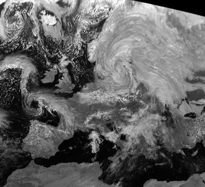 Auf dem Satellitenbild von Europa ist über dem Golf von Biskaya ein kleines aber gut ausgeprägtes Tief erkennbar. Orkantief 'Xynthia' befindet sich mit seinem Kern über der Ostsee. Im westlichen Mitteleuropa macht sich allmählich der Einfluß von Hoch 'Harro' bemerkbar, der Bodensee, die verschneiten Alpen und der Gardassee sind bereits zu sehen.