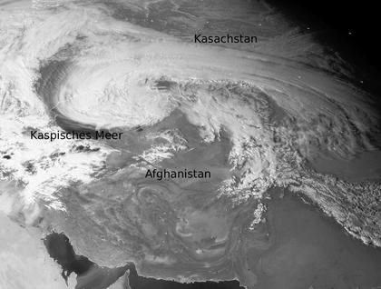 Ein gut ausgebildetes Tiefdruckgebiet mit dichten Wolken in Form eines Flügels liegt am Samstag Mittag über vom nördlichen Kaspischen Meer und nordöstlich davon in Kasachstan. Aus den dichten Wolken fällt in Kasachstan häufig Regen, in den nördlichen Regionen auch Schnee, zudem bringt das Tief auch einigen Wind. Weiter nach Süden zeigen sich von Afghanistan bis nach Pakistan und Indien dagegen kaum Wolken, auch der schneebedeckte Himalaya sticht deutlich hervor. (Bildquelle: NERC Satellite Receiving Station, Dundee University, Scotland, http://www.sat.dundee.ac.uk/)