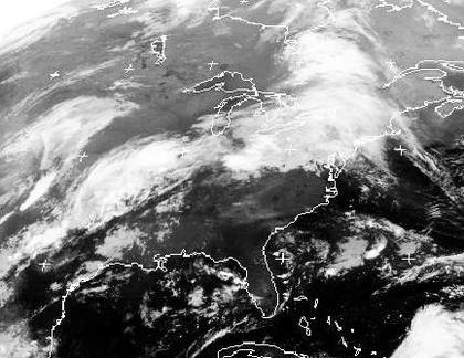 Über den USA, von Texas bis nach Neuengland erstreckt sich eine Luftmassengrenze, die im Satellitenbild an der Bewölkung in diesem Bereich zu erkennen ist. Sie bringt teils kräftigen Regen, teils auch kräftige Gewitter.