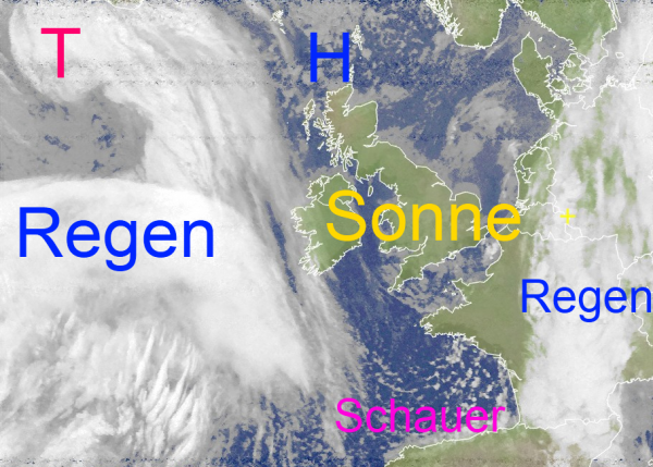 Aus einem dichten Wolkenband über Mitteleuropa tröpfet es regional noch. Eine wolkenärmere Zone mit gelegentlichem Sonnenschein befindet sich derzeit über Westfrankreich, den Britischen - Inseln und Südskandinavien. Diese Zone legt sich morgen über Mitteleuropa und sorgt auch bei uns zumindest gebietsweise für freundlicheres und trockenes Wetter, bevor abends die neuen Regenwolken des Tiefs südlich von Island auf den Nordwesten unseres Landes übergreifen.