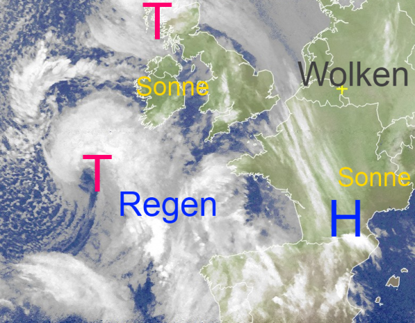 Während in der feucht-milden Luftmasse über Mitteleuropa meist dichtes Wolkengrau herrscht, gibt es vor allem über den Britischen Inseln, sowie Südfrankreich größere sonnige Lücken.