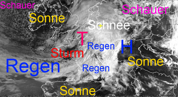 Tief BIANCA zieht heute von Nordfrankreich mit seinem Zentrum über die Südhälfte unseres Landes hinweg. Nördlich seiner Achse fällt dabei zum Teil kräftiger Schneefall bis in tiefere Lagen herab. Dementsprechend muss mit akuten Verkehrsbehinderungen gerechnet werden. Südlich seines Zentrums steigt die Schneefallgrenze bis ins höhere Bergland. Außerdem drohen hier bis zum Abend schwere Sturmböen. In der Nacht wird es auch im Süden auf der Rückseite des Tiefs wieder kälter und es kann zu Schnee(regen)- und Graupelschauern kommen.